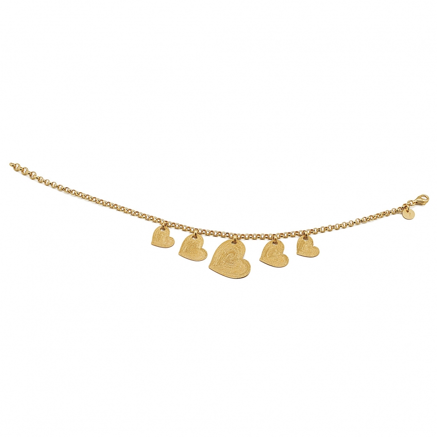 Bracciale da donna in argento 925 con placcatura in oro giallo 18 kt della collezoione cuori di Stefano Patriarchi. Ogni gioiello è unico interamente reallizzato a mano in Italia precisamente a Arezzo. Il bracciale ha una lunghezza di 21 cm con chiusura a moschettone che permette di adattare il gioiello al polso di chi lo indossa.