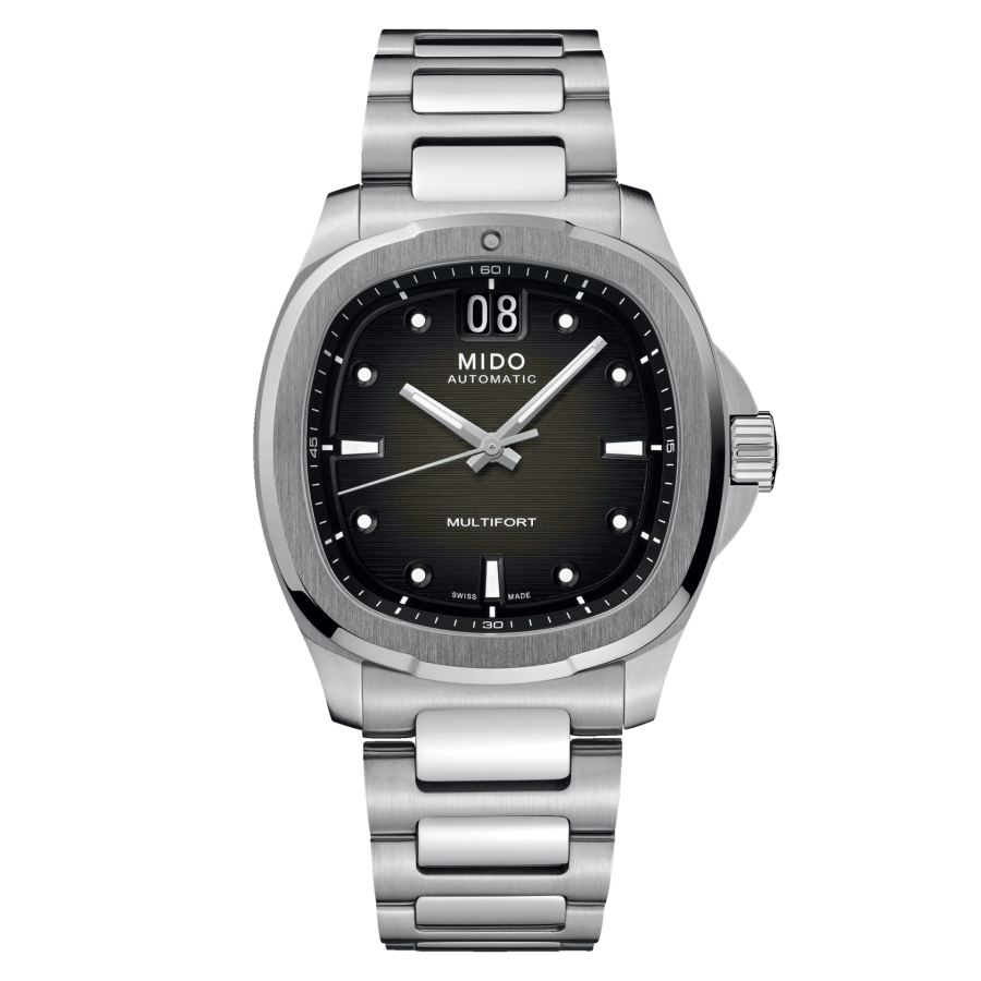 Orologio automatico da Uomo della collezione Multifort di MIDO. La cassa a forma di TV torna al centro della scena per il Multifort TV Big Date, tanto intenso quanto preciso, grazie al suo formidabile movimento meccanico con riserva di carica pari a 80 ore. Cassa con Fondello a vista, Corona a vite. le dimensioni sono di 39mm x 40mm con uno spessore di 11.5mm, il materiale è acciaio inossidabile. Il quadrante color Nero con vetro zaffiro antiriflesso da entrambi i lati. Il cinturino è in acciaio inossidabile. La resistenza all'acqua è di 10 atm . Il gioiello verrà spedito con scatola e garanzia di due anni originali MIDO.Immagini