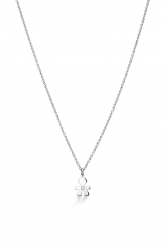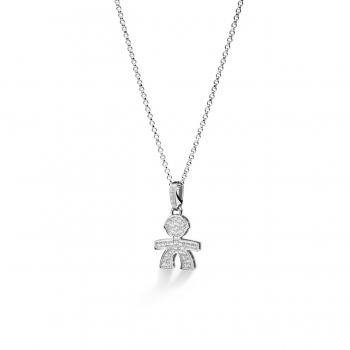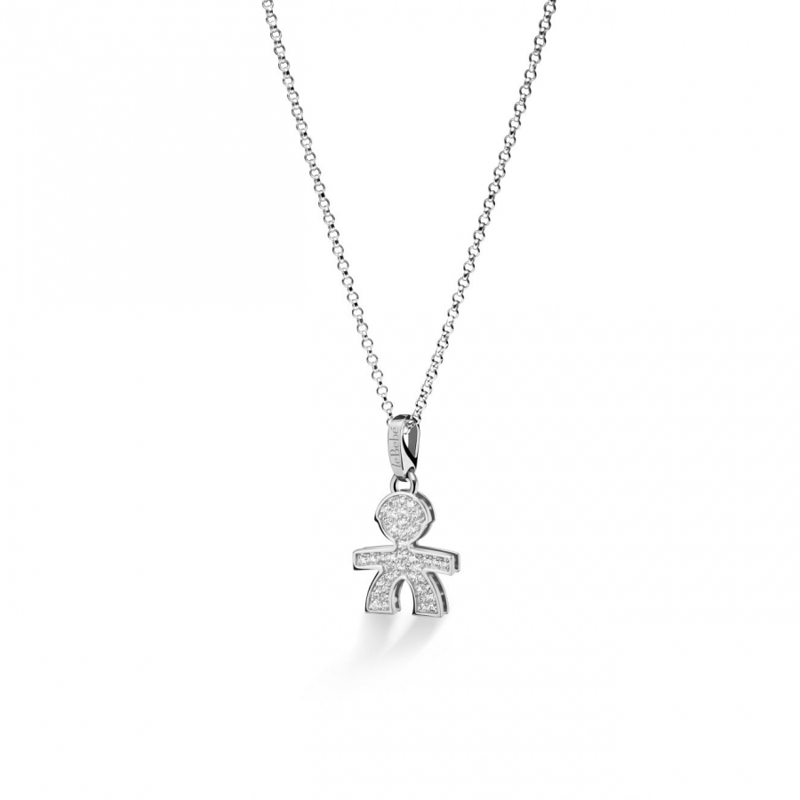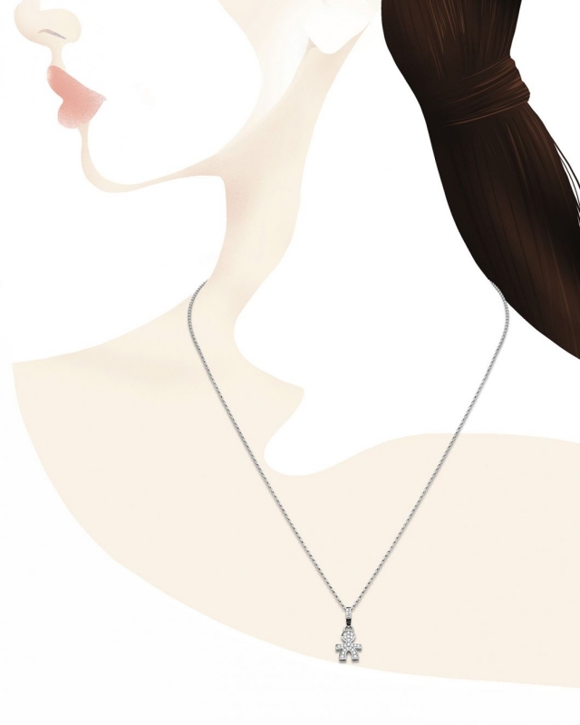 Collana da donna in oro bianco 18 kt della collezione LeBèbe gioielli con bimbo pendente arricchita da diamante con caratura di 0.11 La lunghezza è di 45 cm regolabile con moscettone. Il gioiello è interamente fatto a mano in Italia L'amore è fatto di piccole cose