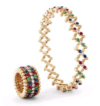 In oro 18kt, 72 PIETRE: DIAMANTI BIANCHI colore F-G,purezza VS per una caratura di 0.87- RUBINI ct.0.75- TSAVORITI ct. 0.65- ZAFFIRI BLU ct. 0.82