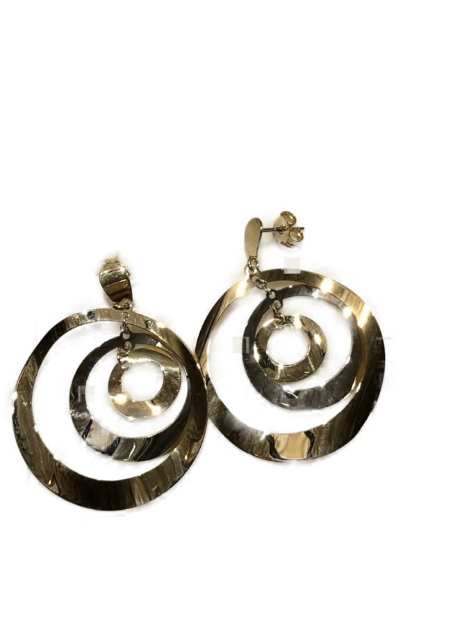 Orecchini in oro 18 kt con tre cerchi pendenti e un peso di 6.9 grammi per coppia. Interamente realizzato a mano in Italia da mastri orafi. La chiusra è a farfallina e il gioiello verrà spedito con scatola e garanzia originale.Ti potrebbe interessare anche
