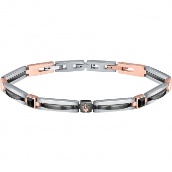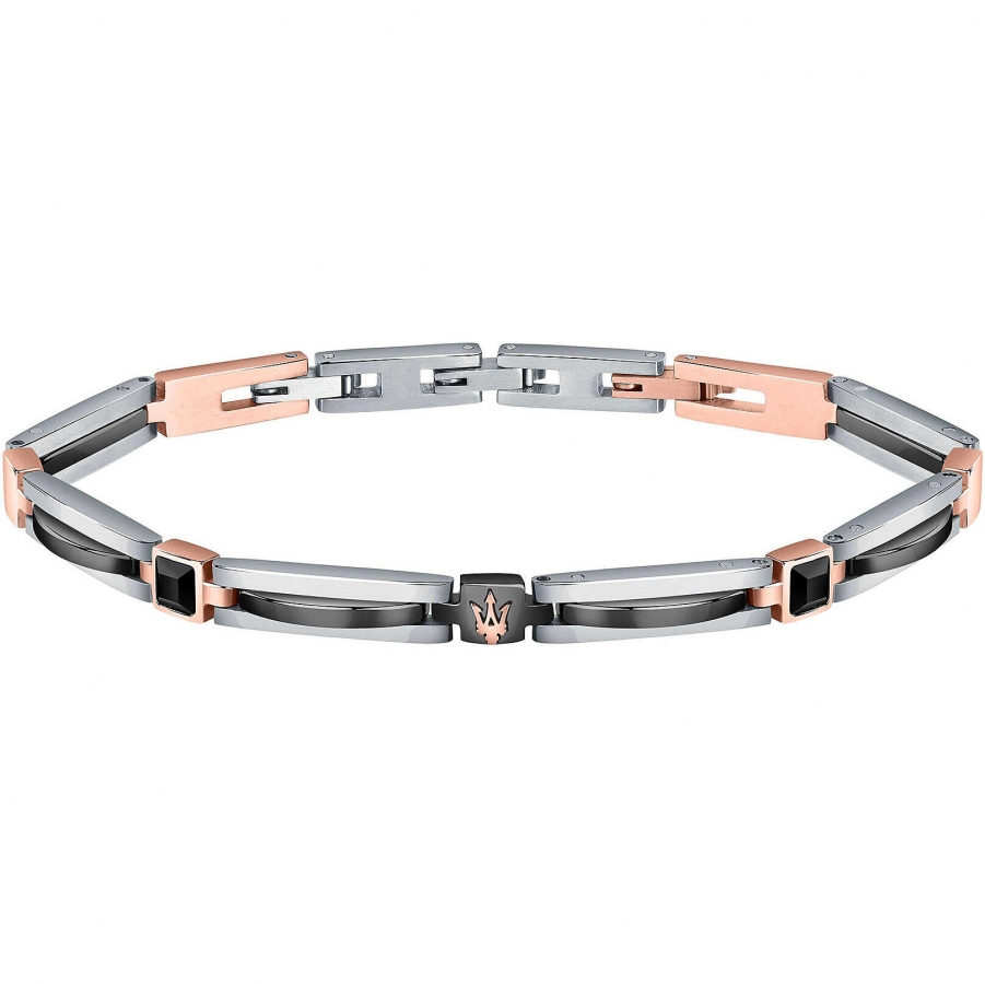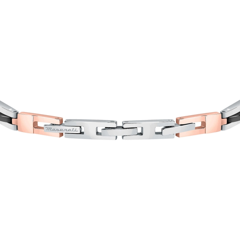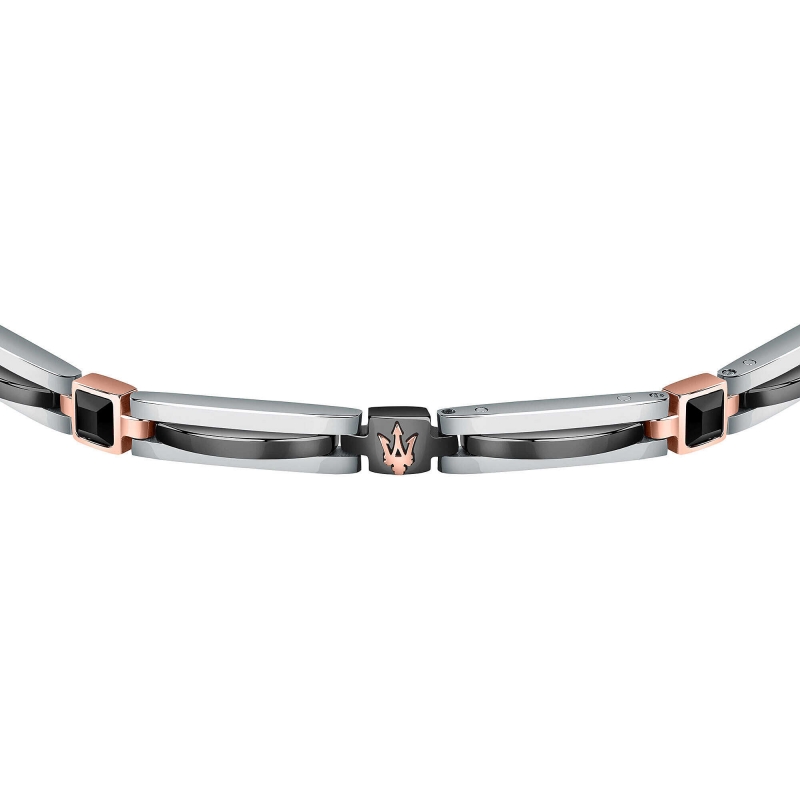 Bracciale da uomo del brand Maserati della collezione Jewels. Gioiello realizzato in acciaio,inserti acciao rosa IP nero, IP RG, pietra PP, ceramica di colore nero, misura: 21cm con chiusura a clip. Per uomo forte e dallo stile sportivo. Il gioiello viene spedito con scatola e garanzia originale MaseratiImmagini