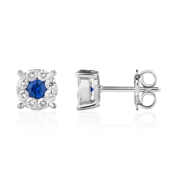Orecchini da donna in oro 18 carati della collezione Moonlight di Forever Unique, Gli orecchini a lobo sono caratterizzati da un cestino dove al centro è presente uno Zaffiro ct 0.12 e circondato da diamanti taglio brillante con una caratura di 0.10. La chiusura è a farfallina il peso totale del gioiello è di 1.5 grammi. Interamente realizzato a mano in Italia e verrà spedito con scatola e garanzia originale.