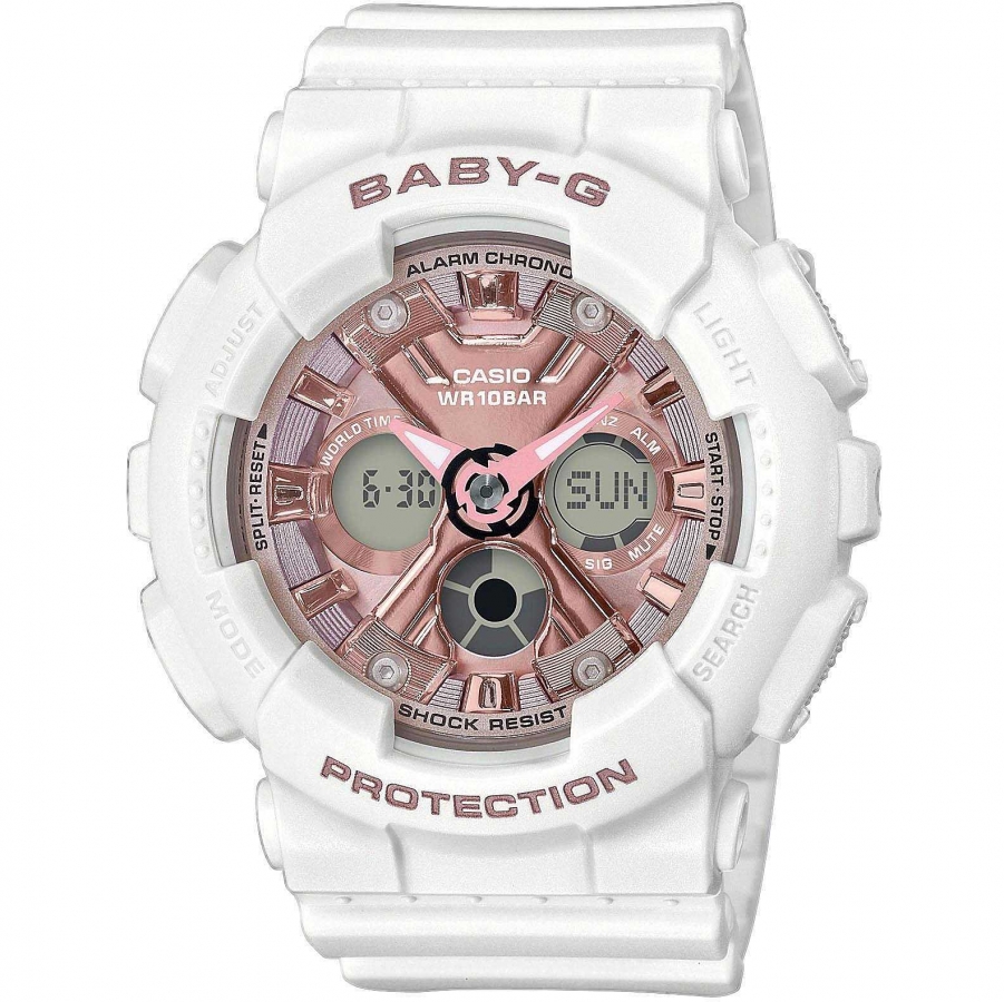 Orologio digitale da Donna della collezione Baby-g di Casio. Modello in Silicone con cassa in resina protetta da vetro Minerale. Le dimensioni sono di 46,3 mm x 43,4 mm x 15,8 mm; peso totale è di 45 g. Modello con diverse funzionalità come il cronometro, l'allarme giornaliero, calendario automatico e luce LED per illuminare il quadrante. L'orologio è resistente all'acqua 10 atmosfere. Questo Gioiello verrà spedito con scatola e garanzia originale Casio.Immagini