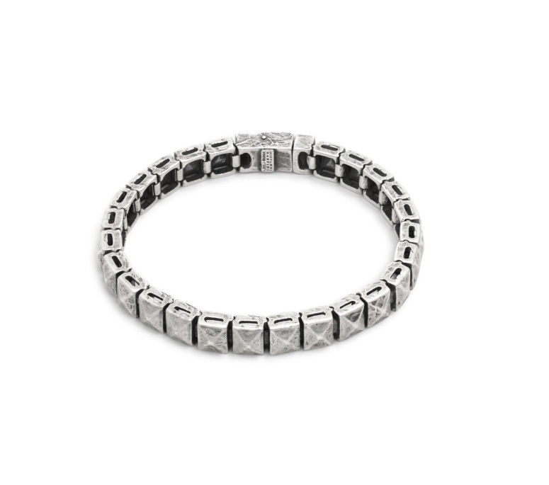 Per chi ama un look deciso e di forte carattere. Questo bracciale in argento brunito è costituito da tanti segmenti quadrati, ognuno dei quali presenta il decoro di una singola borchia piramidale. Realizzato a mano in azienda, con la tecnica tradizionale della fusione a cera persa. Argento 925 Lunghezza 19 cm (M), 21 cm (L) Apertura a pressione con chiusura a scatto Fatto a mano in Italia