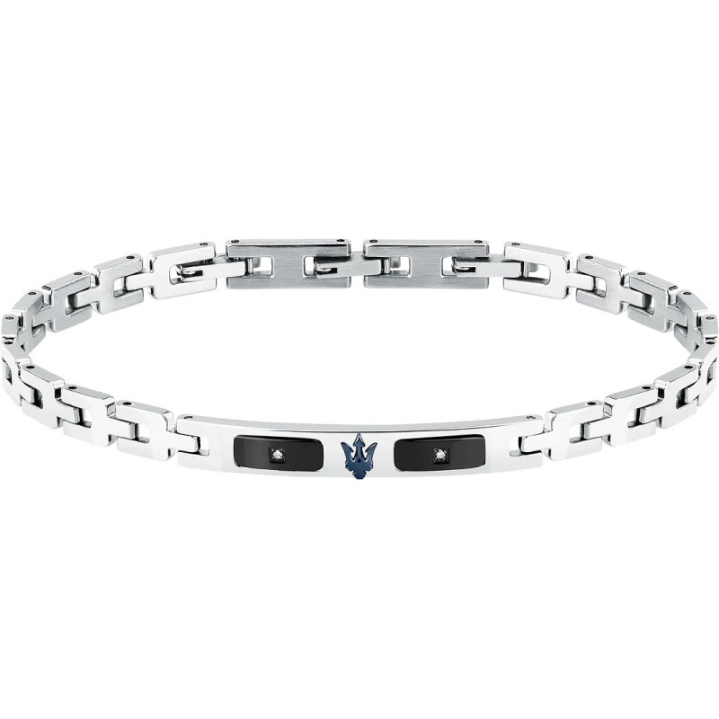 Gioiello da Uomo MASERATI della collezione DIAMONDS realizzato in acciaio inossidabile 316L - Il bracciale è valorizzato da una targhetta centrale con due piccole piastrine in acciaio PVD black impreziosita da due luminosi diamanti bianchi naturali per una caratura complessiva di 0,009 ct - Caratteristico logo a tridente del brand in PVD black - Chiusura con gancio a scatto - Lunghezza regolabile da 18 a 21,5 cm - Garanzia Internazionale: 24 Mesi - Tutti i gioielli sono privi di nickel e ipoallergenici