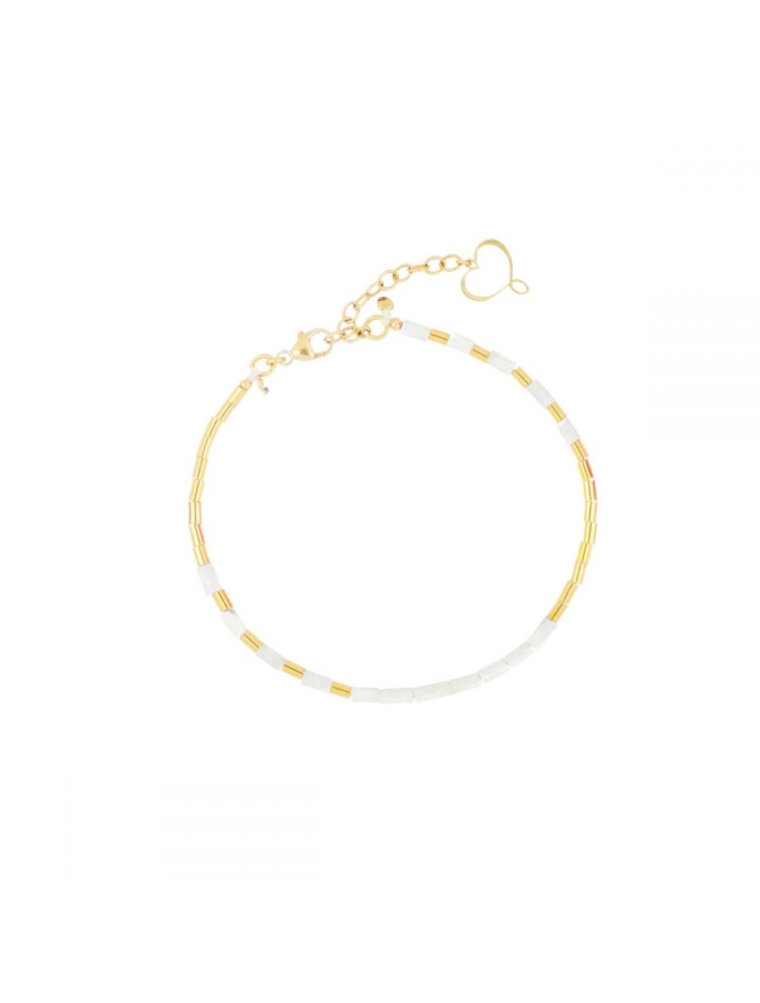Bracciale in argento 925 con galvanica oro giallo ad alto spessore e ad alta resistenza. Il bracciale è composto da tubini di aulite bianca alternati a tubini in argento galvanizzato oro giallo e sfere liscie di 2,5 mm. Può essere regolato da un minimo di 18 ad un massimo di 22 cm. Cuore Maman traforato all'estremità. Chiusura a moschettone.