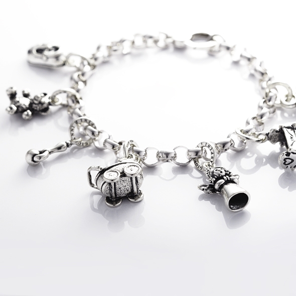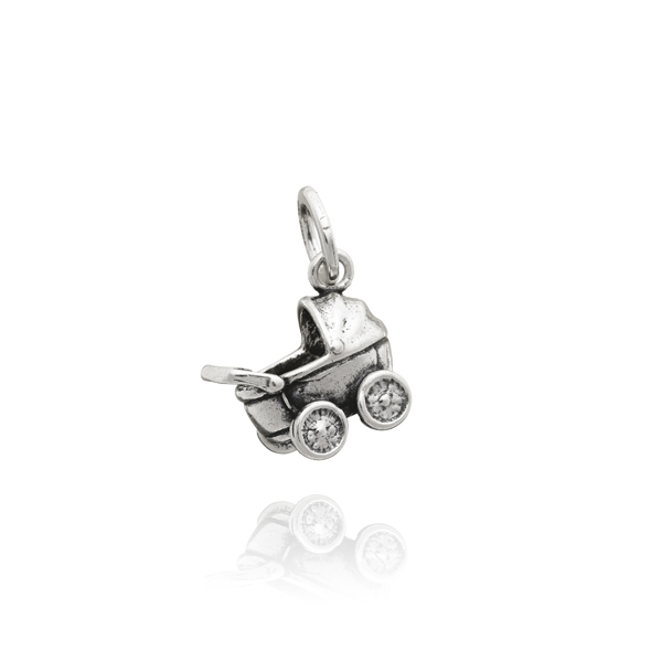 Charm in argento 925 * , Carrozzina di Raspini. Il charm è realizzato artigianalmente a mano in Italia, è munito di maglina con logo Raspini e può essere inserito facilmente su collane, bracciali, portachiavi e orecchini. Charm ideale per creare un gioiello unico e personale, adatto a tutte le neomamme.Immagini