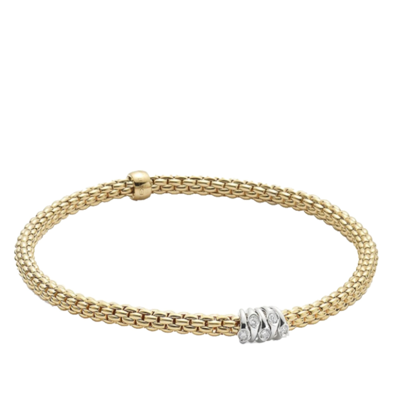 Bracciale da donna flessibile di FOPE interamente realizzato in oro 18 carati , con rondelle in oro bianco e pavé di diamanti. La caratura dei diamanti è di 0.07 totale. Il gioiello è interamente realizzato a mano in Italia da mastri orafi e verrà spedito con scatola e garanzia originali.Immagini