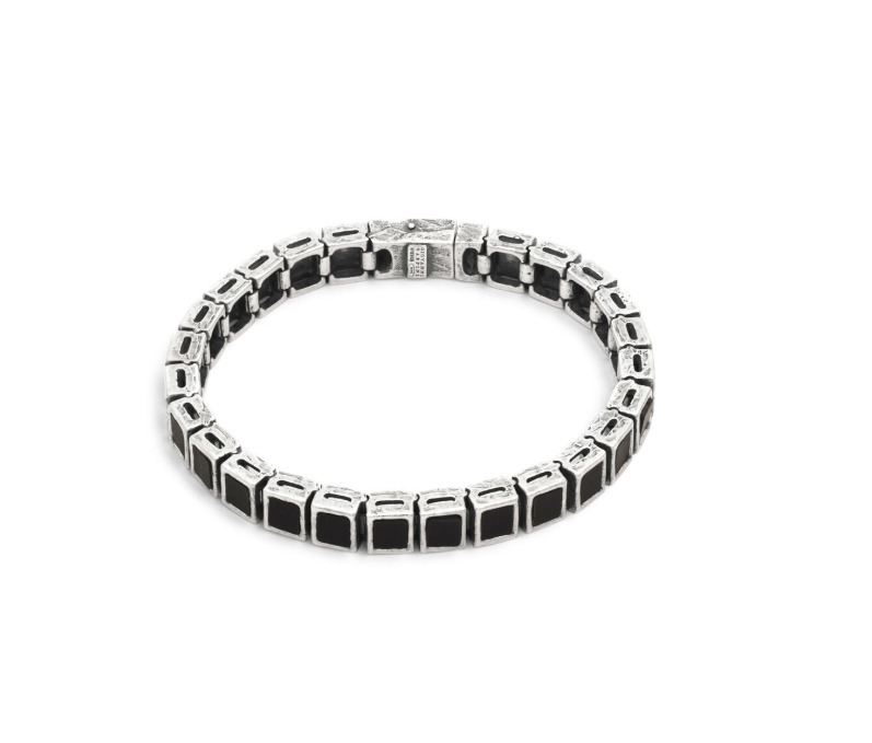 Argento brunito e resina nera per un iconico bracciale Tennis Box. Realizzato con una sequenza di castoni quadrati in argento, ognuno dei quali ospita una resina nera leggermente opaca. Un dettaglio che aggiunge modernità e contrasto materico al gioiello. Argento 925 e resina nera Lunghezza 19 cm (M), 21 cm (L) Apertura a pressione con chiusura a scatto Fatto a mano in ItaliaTi potrebbe interessare anche