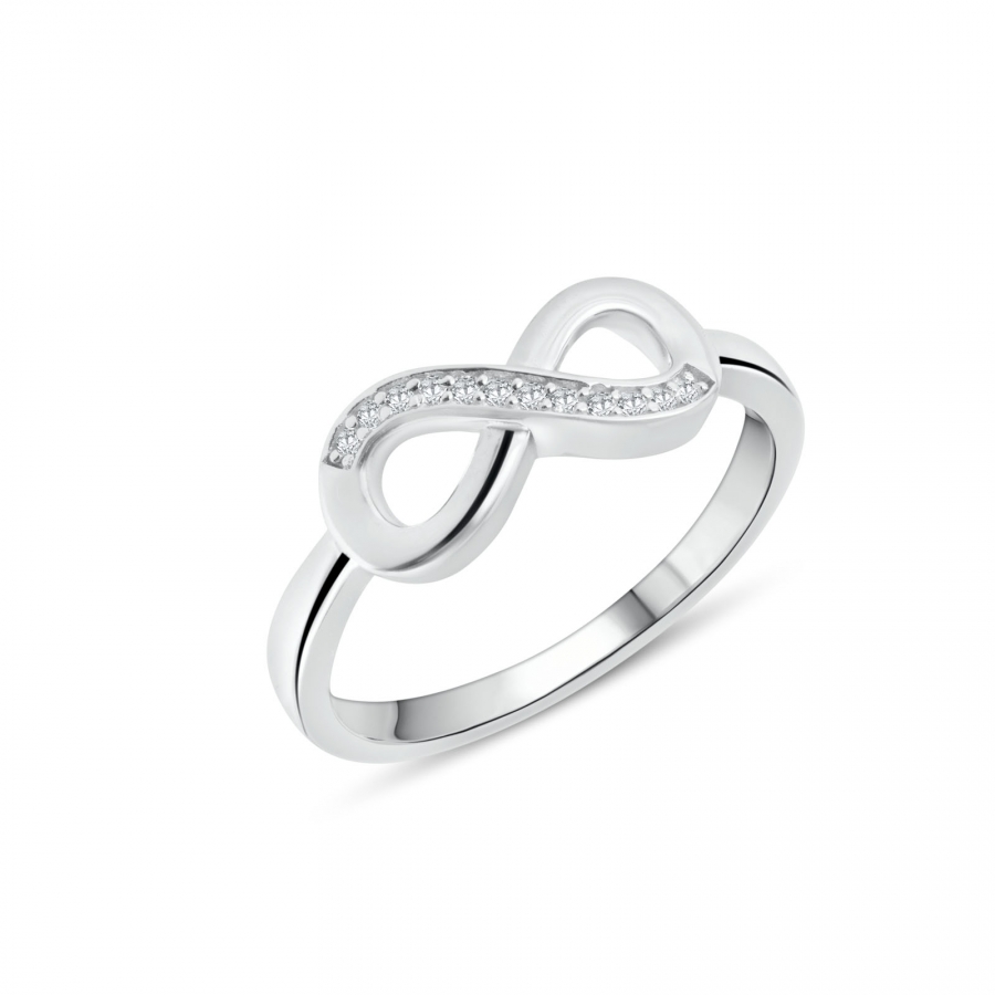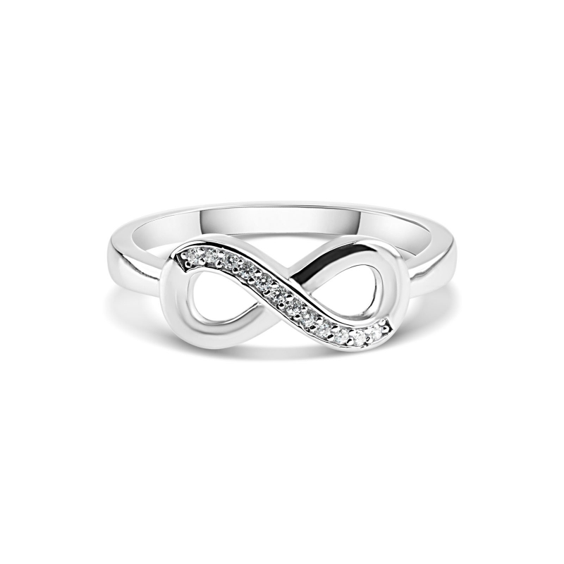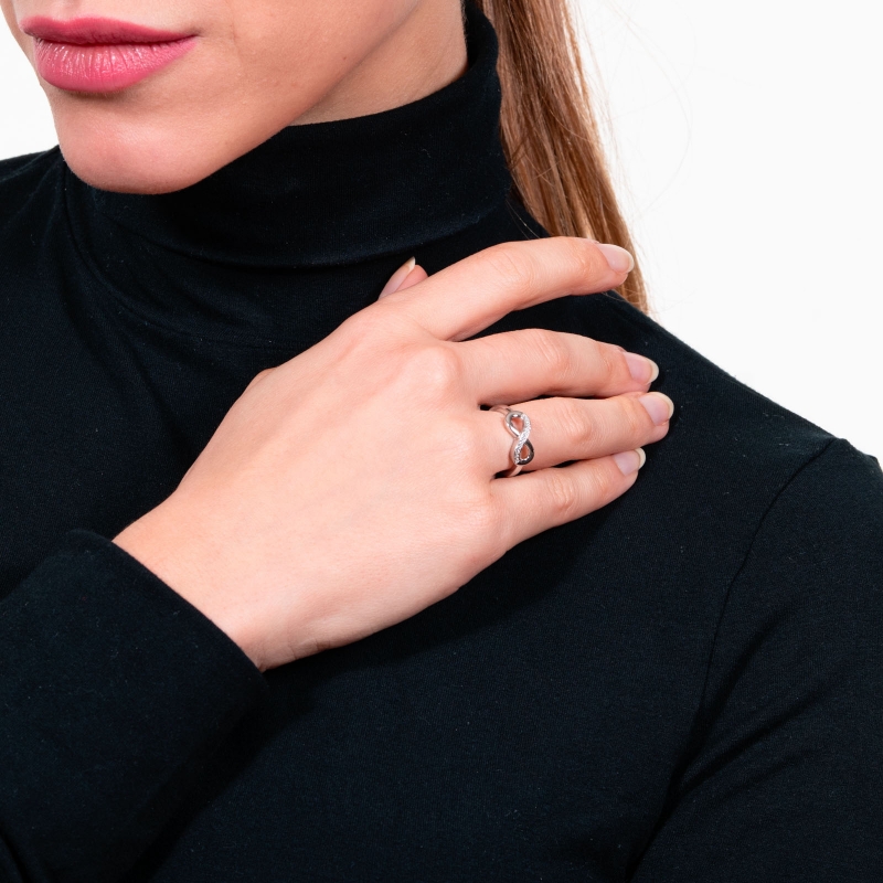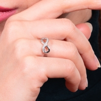 Anello da donna in argento 925 con simbolo dell'infintio impreziosita da zirconi. Le pietre sono zirconi cubic incastonate a mano. L'argento è placcato in rodio, rigorosamente “nickel free†che conferisce al gioiello una brillantezza e resistenza all'usura nel tempo. Interamente realizzato in Italia. Quest'anello viene spedito con scatola e garanzia originale.Immagini