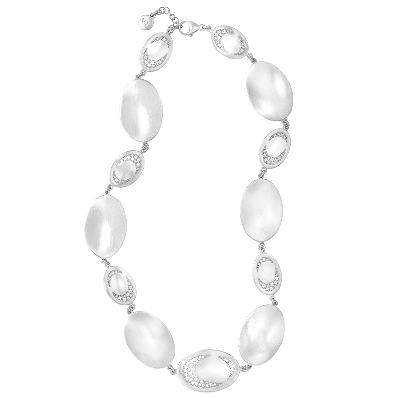 Collana in argento 925 impreziosita da un pavè di zirconi. La lunghezza del gioiello è di 42cm più 3 cm. Comoda chiusura a moschettone. L'ovale si collega all'idea di continuità e armonia, poiché rappresenta un'evoluzione naturale del cerchio, una forma geometrica perfetta ,simmetrica e per la sua capacità di creare linee sinuose e fluide, che possono accentuare la bellezza e la delicatezza di un pezzo, grazie anche al pavè di zirconi e alla spazzolatura realizzata a mano su ciascun elemento. Lo speciale rivestimento con trattamento che protegge dalla naturale ossidazione del metallo. Interamente realizzato a mano in Italia. Le placcature sono rigorosamente senza alcun rilascio di nichel e cadmio. Il gioiello verrà spedito con scatola e garanzia originali di Aquaforte.Immagini