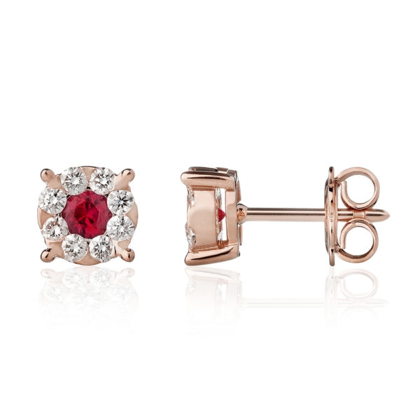 Orecchini da donna in oro 18 carati della collezione Daisy di Forever Unique, Gli orecchini a lobo sono caratterizzati da un cestino dove al centro è presente un Rubino ct 0.12 e circondato da diamanti taglio brillante con una caratura di 0.10. La chiusura è a farfallina il peso totale del gioiello è di 1.97 grammi. Interamente realizzato a mano in Italia e verrà spedito con scatola e garanzia originale.