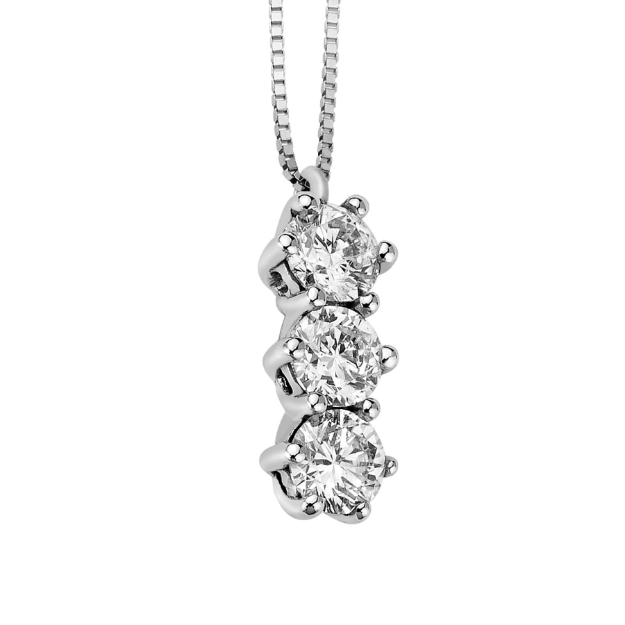 Collana DonnaOro trilogy realizzata in oro bianco 18kt e impreziosita da un tre diamanti bianchi naturali, con caratura totale di 0,75 ct. G-Si. Il girocollo si completa di una catenina in oro bianco con chiusura a moschettone pratica e sicura. Un gioiello classico e senza tempo, perfetto per le donne di ogni età, ideale da indossare quotidianamente e in ogni situazione, da quella formale a quella più casual Il gioiello verrà spedito con scatola e garanzia originali.