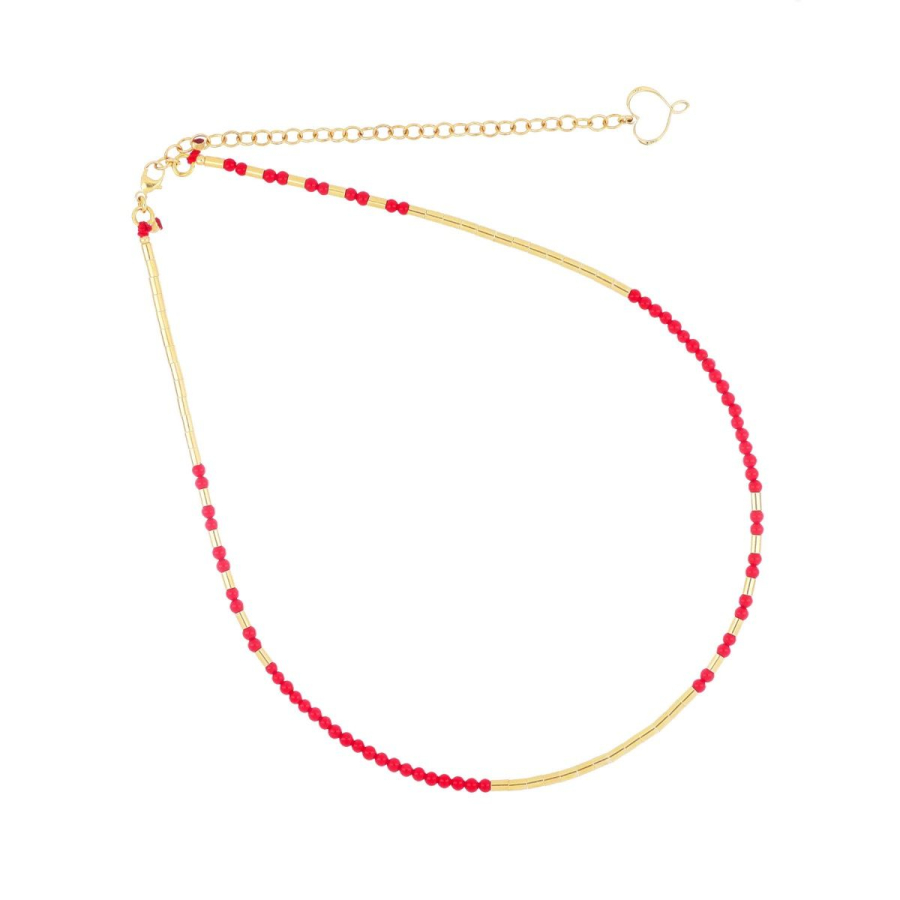 Girocollo in argento 925 con galvanica oro giallo ad alto spessore e ad alta resistenza. Il girocollo è composto da pasta di corallo alternata a tubini in argento galvanizzato oro giallo. Può essere regolato da un minimo di 34 ad un massimo di 43 cm. Cuore Maman traforato all'estremità. Chiusura a moschettone. Questo Gioiello viene spedito con scatola e garanzia originali.