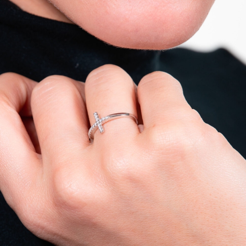 Anello da donna in argento 925 con croce centrale in finitura lucida e zirconi bianchi. Le pietre sono zirconi cubic incastonate a mano. L'argento è placcato in rodio, rigorosamente “nickel free†che conferisce al gioiello una brillantezza e resistenza all'usura nel tempo. Interamente realizzato in Italia. Quest'anello viene spedito con scatola e garanzia originale.Immagini