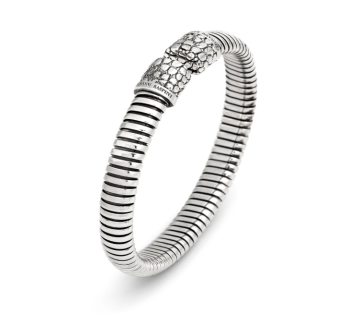 Nato dall’eleganza iconica della maglia tubogas, questo bracciale in argento richiama la grande tradizione della gioielleria del Novecento. Giovanni Raspini lo personalizza mediante il segno iconico della texture di coccodrillo che caratterizza le due estremità, realizzate in argento fuso a cera persa. Argento 925 Misura ovale interno 6 x 5 cm Fatto a mano in Italia Il gioiello verrà spedito con scatola e garanzia originali.