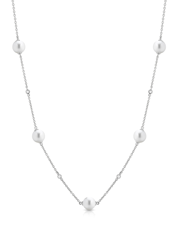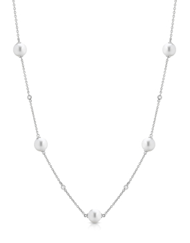 Collana in oro bianco 18kt impreziosita da Perle giapponesi Akoya di 8/ 8.5mm di diametro alternate da diamanti con caratura di 0.08ct. La collana è regolabileda 40 a 43 cm con comoda chiusura a moschettone. Il gioiello è prodotto interamente in Italia da maestri orafi.Questo gioiello verrà spedito con garanzia e scatola originali Coscia.