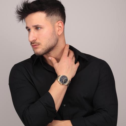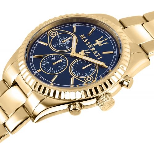 L'orologio multifunzione da uomo di Maserati della collezione Competizione è un modello dal design esclusivo ideato per l'uomo dal carattere audace ed esigente. Questo multifunzione è realizzato in acciaio resistente ed elegante, il cinturino è in color acciaio e gold, la cassa tonda di 43 mm ha fondo e corona serrati a vite, il quadrante è blu con indici a bastoni. Il cinturino in acciaio, caratterizzato dall'accostamento di colore argento e oro abbinati tra di loro, insieme alla tonalità black del quadante, rendono questo orologio Maserati perfetto per chi ama sfoggiare un look curato in ogni dettaglio, dove non deve mancare la giusta via di mezzo tra classe ed eleganza. Il gioiello verrà spedito con scatola e garanzia internazionale di due anni Maserati.Immagini
